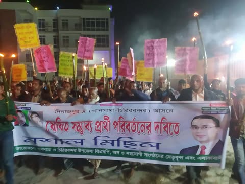 উজ্জ্বল রায়,খানসামা (দিনাজপুর) প্রতিনিধি:-দিনাজপুর-৪ (খানসামা-চিরিরবন্দর) আসনে বিএনপির মনোনীত প্রার্থী পরিবর্তনের দাবিতে মশালমিছিল হয়েছে। বৃহস্পতিবার সন্ধ্যার পরপরই খানসামা উপজেলার পাকেরহাট চৌধুরী রাইস মিল চত্বর থেকে অগ্নিমশাল হাতে স্লোগানে স্লোগানে পাকেরহাটের প্রধান সড়ক প্রদক্ষিণ করে এক বিশাল মিছিল করেছেন বিএনপির মনোনয়ন প্রত্যাশী কর্নেল (অব.) মোস্তাফিজুর রহমান চৌধুরীর অনুসারীরা। এসময় তারা–”জিয়ার সৈনিক এক হও-এক হও, অবৈধ মনোনয়ন, মানিনা-মানবোনা”, “প্রার্থী পরিবর্তন চাই”, “মোস্তাফিজুর রহমানকে মনোনয়ন দাও”—এমন শ্লোগানে পুরো এলাকা মুখরিত হয়ে ওঠে। পাকেরহাটের প্রধান সড়ক প্রদক্ষিণ শেষে মিছিলটি আবার একই স্থানে ফিরে এসে সমাবেশে পরিণত হয়। এদিকে প্রার্থী পরিবর্তনের দাবিতে এমন মশাল মিছিলে পুরো অঞ্চলে রাজনৈতিক অস্থিরতা তৈরি হয়েছে। স্থানীয় রাজনৈতিক পর্যবেক্ষকদের মতে, তৃণমূলের মধ্যে কর্নেল মোস্তাফিজুর রহমানের প্রতি সমর্থন বেশ প্রবল। ফলে তাঁকে মনোনয়ন না দিলে খানসামা ও চিরিরবন্দর এই দুই উপজেলায় দলের অভ্যন্তরীণ বিভাজন আরও বাড়বে বলে আশঙ্কা করছেন অনেকে। উল্লেখ্য, দিনাজপুর-৪ (খানসামা-চিরিরবন্দর) আসনে বিএনপির কেন্দ্রীয় নির্বাহী কমিটির সদস্য আলহাজ্ব আখতারুজ্জামান মিয়াকে প্রার্থী ঘোষণা করে দল। এরই প্রতিবাদে এর আগে গত ১৭ নভেম্বর সন্ধ্যায় প্রার্থী পরিবর্তনের দাবিতে র্যালি, মৌন মিছিল ও মতবিনিময় সভা এবং ১৯ নভেম্বর সন্ধ্যায় দিনাজপুর প্রেসক্লাবে প্রার্থী পরিবর্তনের দাবিতে সংবাদ সম্মেলন করেন জেলা বিএনপির সাবেক ভারপ্রাপ্ত সভাপতি অ্যাডভোকেট মো. আব্দুল হালিম এবং কর্ণেল (অব.) মোস্তাফিজুর রহমান চৌধুরী।