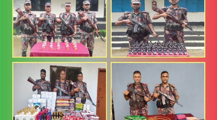 অদ্য ০৪ জুলাই ২০২৫ তারিখে বিজিবি’র যশোর ব্যাটালিয়ন (৪৯ বিজিবি) এর টহলদল হিজলী, পাঁচপীরতলা, বেনাপোল বিওপি ও বেনাপোল আইসিপি এবং আমড়াখালী চেকপোষ্টের সীমান্ত এলাকায় মাদকদ্রব্য ও চোরাচালান বিরোধী অভিযান পরিচালনা